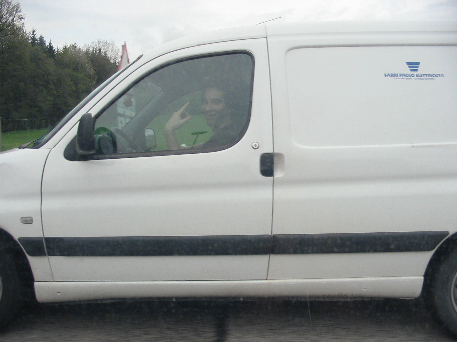 con relativi equipaggi costituiti da resto del gruppo e ospiti. La gara, gia` di per se condotta a una media improbabile, e` stata piu` volte interrotta dalla Safety Car del Cazzo, ovvero la polizia svizzera dei miei coglioni che ha pensato bene di controllare tutto il furgone alla frontiera (ma entrate in europa come le persone normali, sfigati di orologiai) e la polizei tedesca hardcore warrior che con la scritta “Bitte Folgen” ci ha cortesemente invitati a fermarci solo perche` abbiamo un’auto vecchia e con targa italiana. Una volta fatto cio` un paio di soggetti che sembravano usciti da un rave per decerebrati hanno constatato che eravamo innocui, non prima di averci cagato il cazzo per una mezzoretta. Arrivati a Karlsruhe si e` assistito ad un appassionante arrivo in volata, il fotofinish deve ancora assegnare un vero vincitore per quanto che, alla luce dell’ora e mezzo impiegata a trovare i rispettivi alloggi l’unica grande verita` e` che hanno perso tutti.Cena? Birra. Fanculo e tutti a letto, oggi giu` di conferenze e darcene.